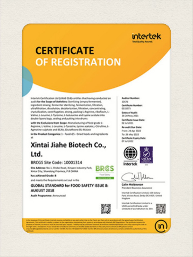 汕頭佳禾生物科技有限公司是一家致力于氨基酸及其衍生物研發(fā)、生產(chǎn)和銷售的國(guó)家高新技術(shù)企業(yè),先后通過(guò)了國(guó)家藥品GMP認(rèn)證,ISO9001質(zhì)量體系認(rèn)證、ISO14001環(huán)境管理體系認(rèn)證。目前,公司擁有“廣東省專精特新中小企業(yè)”、“廣東省氨基酸產(chǎn)品工程技術(shù)研究中心”、“汕頭市生物發(fā)酵工程技術(shù)研究開發(fā)中心”、“汕頭市知識(shí)產(chǎn)權(quán)優(yōu)勢(shì)企業(yè)”、“多項(xiàng)國(guó)家發(fā)明專利”、“廣東省守合同重信用企業(yè)”等多項(xiàng)資質(zhì)和榮譽(yù),旗下“佳禾牌”系列產(chǎn)品已成為原料藥行業(yè)知名品牌。 新泰市佳禾生物科技有限公司成立于2012年8月,注冊(cè)資金2億元,公司位于山東泰安新泰市新汶工業(yè)園區(qū),是國(guó) 家級(jí)高新技術(shù)企業(yè)、山東省“專精特新”企業(yè)、山東省制造業(yè)單項(xiàng)冠軍企業(yè)、泰安市科技型中小企業(yè)、泰安市農(nóng)業(yè)產(chǎn)業(yè)化龍頭企業(yè)、中國(guó)生物發(fā)酵產(chǎn)業(yè)協(xié)會(huì)理事單位。
